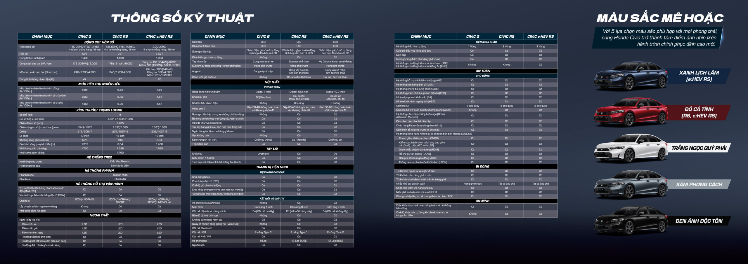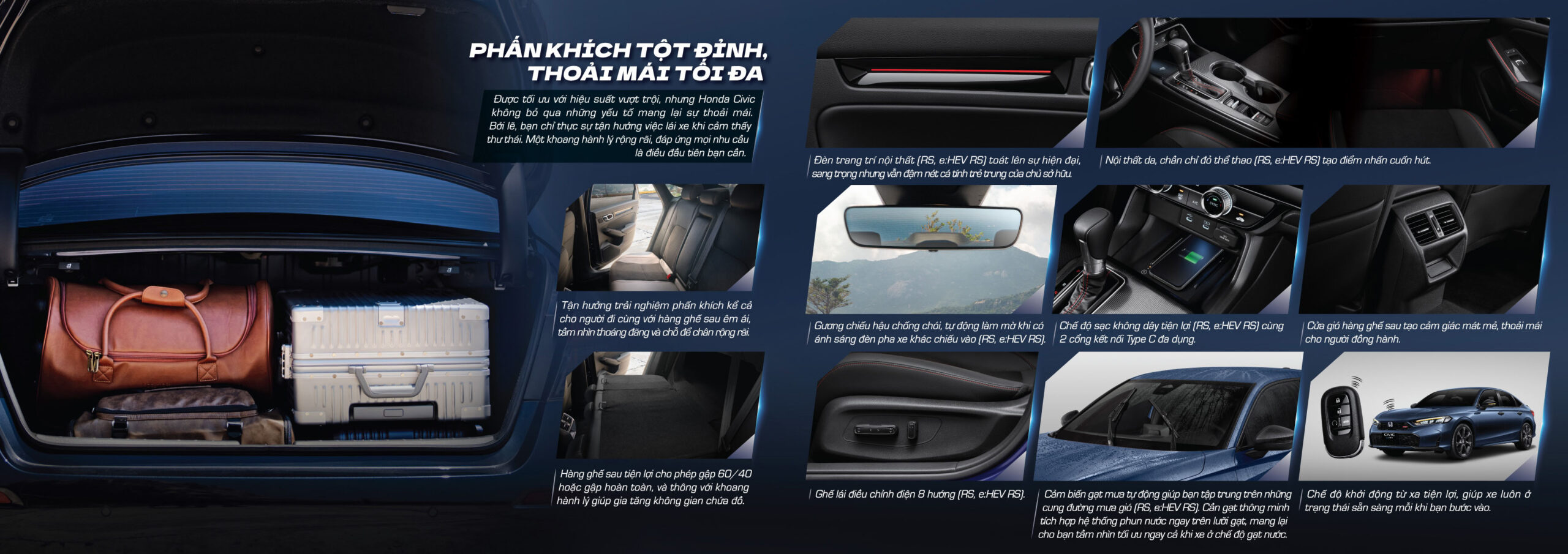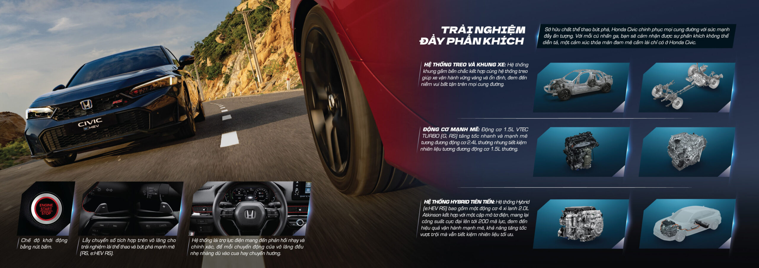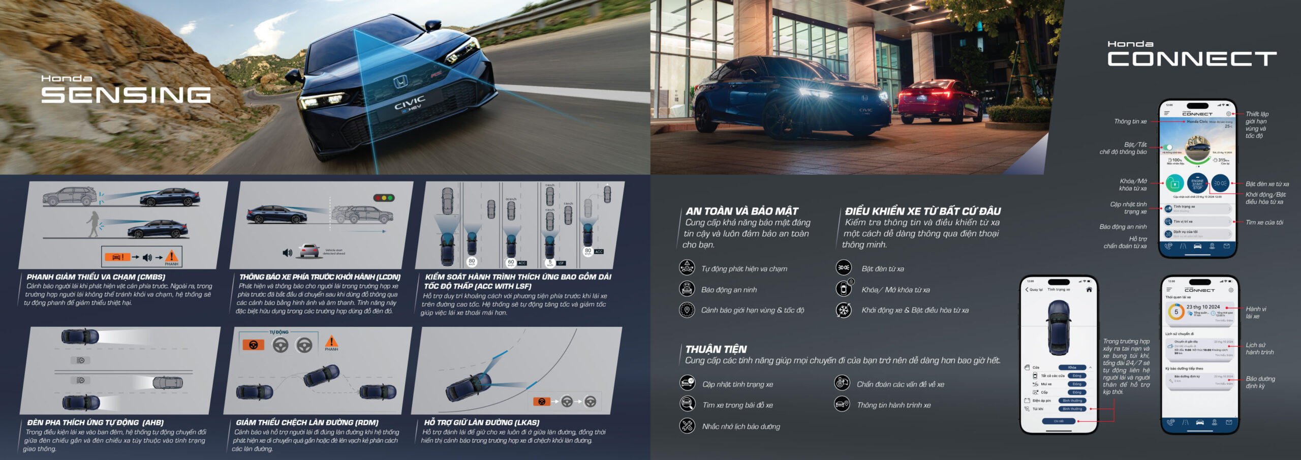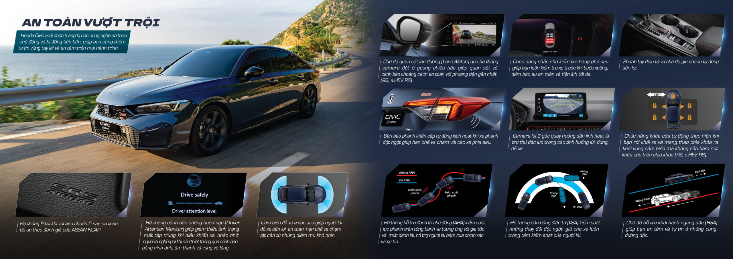 Honda Civic mang tới trải nghiệm đẳng cấp trrong phân khúc Sedan hạng C cùng các công nghệ e:HEV độc quyền tân tiến, Honda SENSING an toàn vượt trội và Honda CONNECT tiện ích, được trang bị các công nghệ an toàn chủ động và bị động tiên tiến, giúp bạn càng thêm tự tin vững tay lái và an tâm trên mọi hành trình.