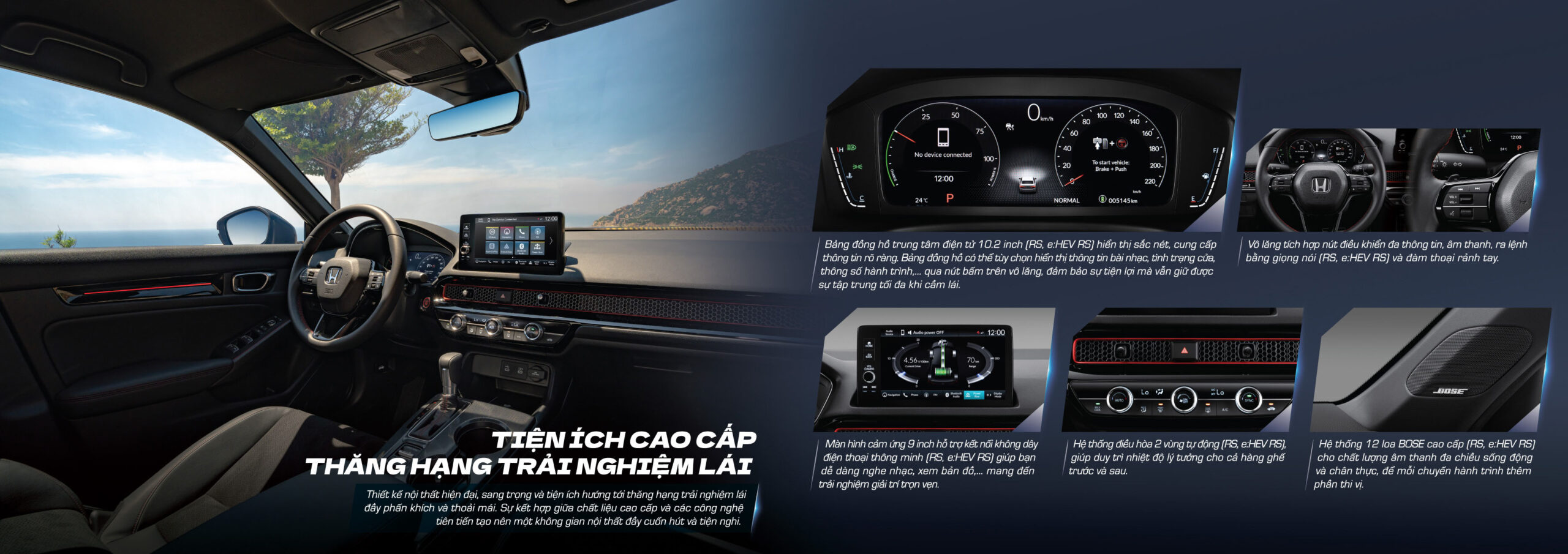 Bảng đồng hồ trung tâm điện tử 10.2 inch (RS, e:HEV RS) hiển thị sắc nét, cung cấp thông tin rõ ràng. Bảng đồng hồ có thể tùy chọn hiển thị thông tin bài nhạc, tình trạng cửa, thông số hành trình, … qua nút bấm trên vô lăng, đảm bảo sự tiện lợi mà vẫn giữ được sự tập trung tối đa khi cầm lái.