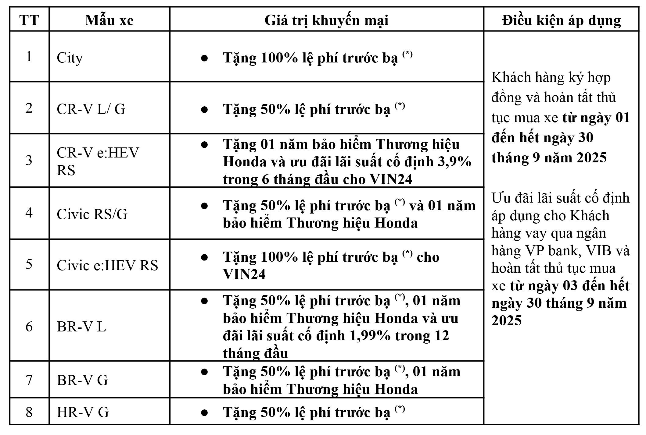Tưng bừng chào đón Đại lễ Quốc khánh 2/9, với mong muốn mang đến nhiều hơn nữa cơ hội trải nghiệm các mẫu xe ô tô Honda và tận hưởng những khoảnh khắc du ngoạn tuyệt vời cho Khách hàng, Honda Việt Nam (HVN) phối hợp cùng hệ thống Nhà Phân phối triển khai chương trình khuyến mại hấp dẫn cho các dòng xe ô tô Honda từ ngày 01 tháng 09 năm 2025 đến hết ngày 30 tháng 9 năm 2025.