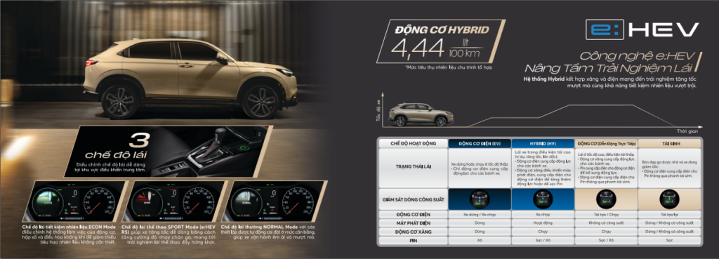 Phiên bản e:HEV RS của HR-V mới sử dụng hộp số e-CVT gồm một mô tơ phát điện để sạc điện cho pin khi cần thiết và hỗ trợ vận hành mô tơ kéo. Mô tơ kéo với vòng quay cực đại 3.500 vòng/phút sản sinh lực kéo mô tơ 253 Nm, không chỉ mang đến vận hành vượt trội mà còn giúp tối ưu hóa hiệu suất nhiên liệu, tạo nên trải nghiệm lái ổn định, êm ái nhưng cũng đầy cảm hứng trên mọi cung đường.